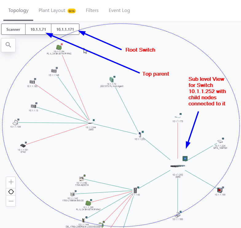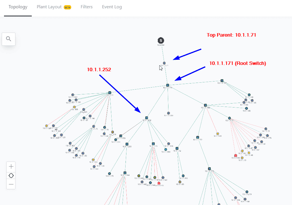 The Top Parent of each network will be one node away from the "scanner" node at the center of the screen. The network is visualized as a star or tree of devices radiating out from the "scanner". This patented method is called a hyperbolic tree.
