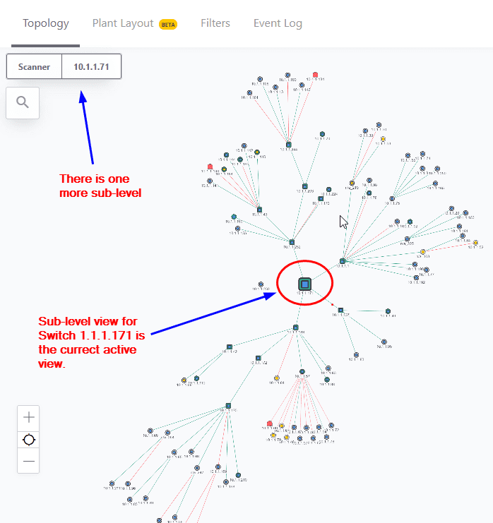 To go up one or more levels in the sub-level views simply click on one of the parent switches IP addresses. If you want to go back to the Scanner Level view simply click "Scanner".